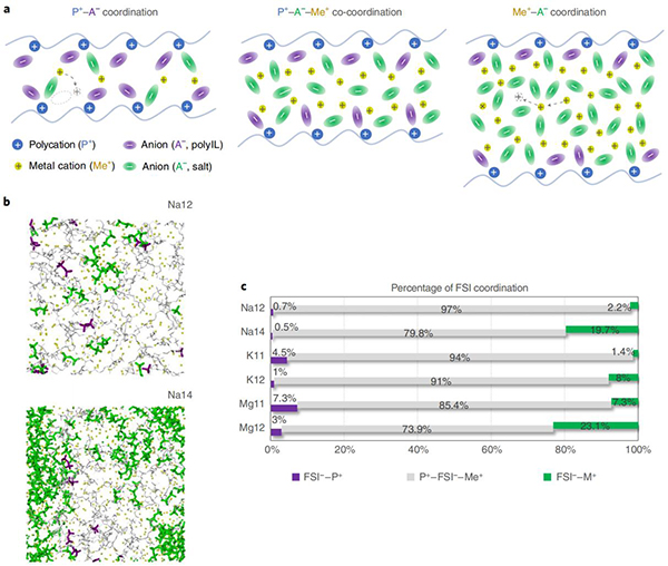 使用具有高理论容量的碱金属(Li、Na或K)作为负极的高能量密度储能技术,对于发展下一代电池至关重要。其中,探索与这种反应性符极兼容的电解质材料,是发展高安全和长寿命电池的关键一环。聚合物电解质(PEs)被认为是最终固态高性能电池的推动者,在抑制爆炸风险和不可控枝晶形成方面展现了巨大优势。基于聚环氧乙烷(PEO)及其共聚物的PE已被广泛研究,但这些材料通常具有低电导率或较低的转移数,这与其结构本质密切相关(例如,金属离子与聚合物骨架中的极性基团的强配位)。同时,已经提出了多种聚合物设计策略来提高金属离子传输和迁移数。例如,引入松散配位重复单元,设计具有受限运动的新阴离子化学物质,使用嵌段共聚物或交联聚合物链是提高离子电导率的另一种方法。最近,阳离子聚合离子液体(PolyILs),其中单体是可聚合的离子液体阳离子,已成为锂盐的潜在固态溶剂,并显示出良好的性能。这种材料既继承了离子液体的优异电化学性能,又继承了聚合物良好热和机械性能。有趣的是,由于独特的锂-阴离子-聚阳离子共配位结构,与几十年前C. Austen Angell提出的“盐包聚合物”电解质(PolyIL-IS)一致。鉴于在锂金属电池中PolyIL-IS的性能,了解此类材料中其他更丰富的金属阳离子的离子传输,可以为设计基于PolyIL-IS的高性能固态电池开辟可能性平台。