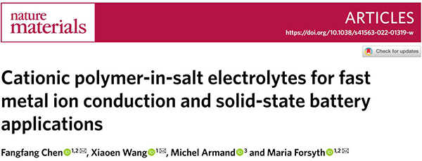 相关研究成果以“Cationic polymer-in-salt electrolytes for fast metal ion conduction and solid-state battery applications”为题发表在Nature Materials上。