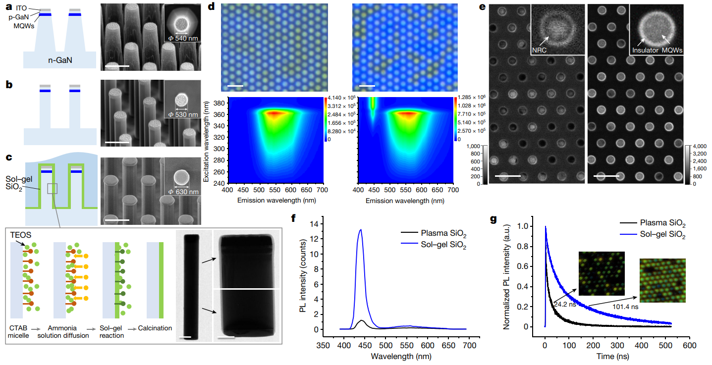 (e) 晶圆上,等离子体增强ALD制造的 SiO2和溶胶-凝胶 SiO2钝化层(右)(λ = 300–700 nm)的亚微米LED棒阵列的全色CL图像