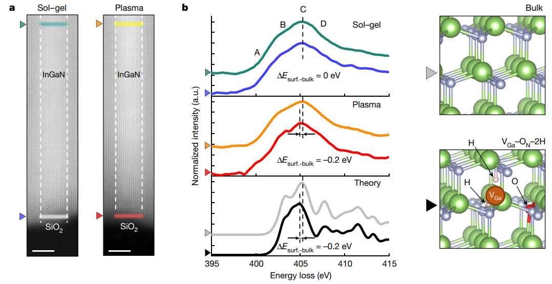 (a) InGaN量子阱的高分辨率STEM图像 (b)N-K边光谱a图中所示区域,及其DFT计算。