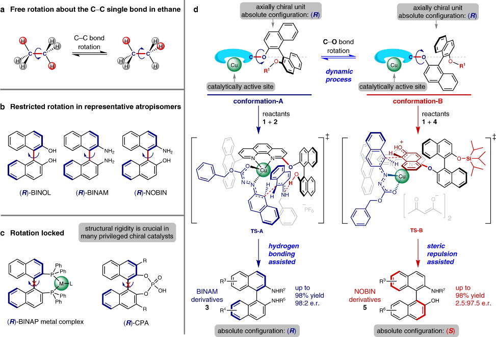 我们知道,构象是原子围绕单键旋转形成的空间排列。但在大多数情况下无法分离纯构象,因为分子在所有可能的构象中不断旋转。有趣的是,当围绕单键的旋转受到限制时,一类称为顺反异构体的特殊构象就可以分离出不同的化学物质。单键的构象和旋转对分子功能和化学转化至关重要,在实际化学应用中,例如在酶催化中构象动力学就起着关键作用。然而,在不对称催化中,众所周知,非酶性手性催化剂的结构刚性通常是实现高水平不对称诱导的必要条件,但对手性催化剂的分子灵活性和构象动力学的研究较少,手性催化剂的构象分离难度较大是阻碍其研究的主要原因,因此揭示其构象与对映体分离之间的关系具有很大的挑战性。轴向手性分子不仅在自然界中非常丰富,而且在许多科学领域取得了巨大的成功,如材料科学和不对称合成领域。1,1′-联二萘酚 (BINOL)、1,1′-联-2-萘胺(BINAM)、2-氨基-2’-羟基-1,1′-联萘(NOBIN)是最突出和最有价值的轴向手性分子。对映体纯的(R)-和(S)-BINOL及其一些衍生物如今已在市场上出售,相比之下,尽管在过去三十年中对其合成进行了大量努力,但具有不同取代模式的对映体纯的BINAMs和NOBINs仍然很难获得,因此迫切需要新的研究解决上述问题。