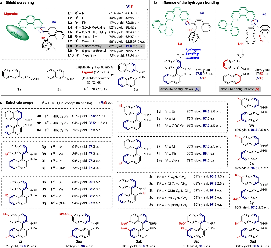 3、筛选菲罗啉单元C9位置上的取代基来寻找合适的屏蔽配体后,在最优屏蔽配体条件下,生成了高度重要的轴向手性1,1′-联萘-2,2′-二胺(BINAM)和2-氨基-2′-羟基-1,1’联萘(NOBIN)衍生物,有着极佳的收率和对映选择性。