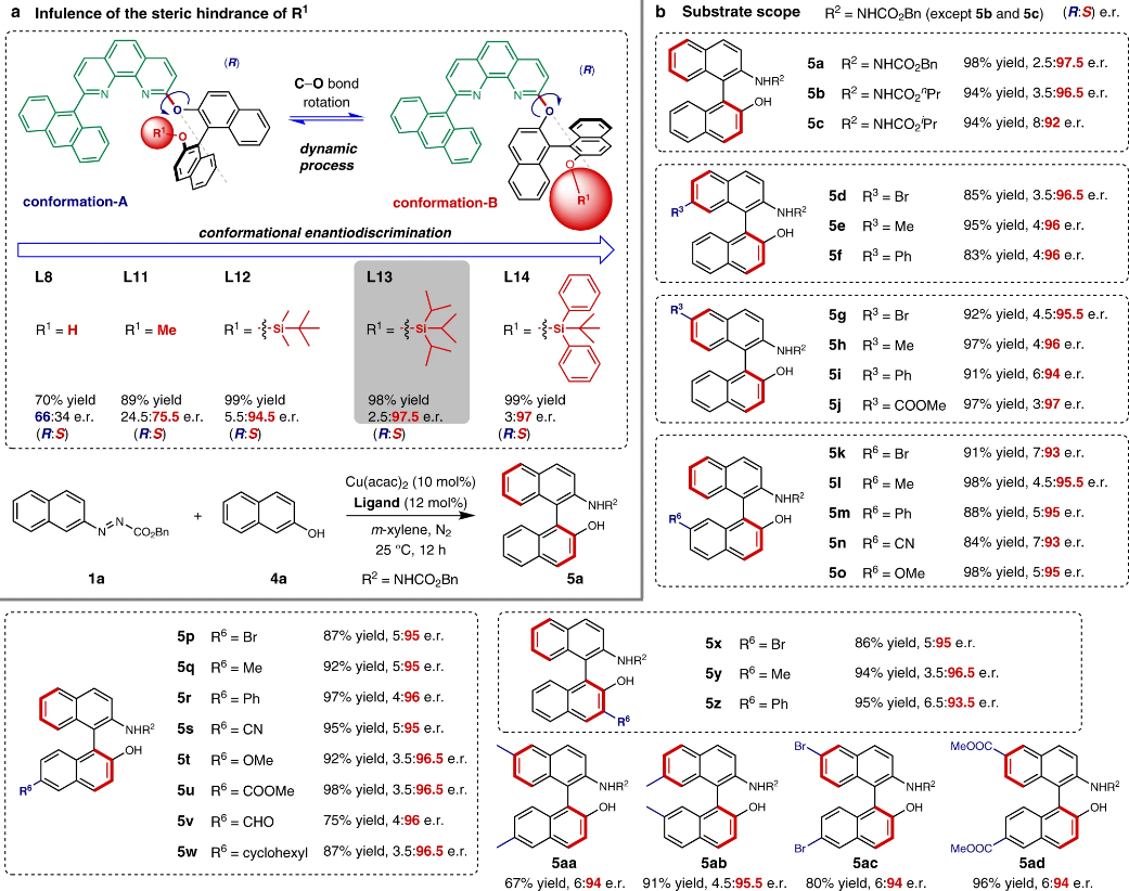 在此,华东理工大学化学与分子工程学院赵梅欣副教授和张志鹏教授团队报道了一种由非手性催化活性单元(N,N-双齿-1,10-菲罗啉)和轴向手性1,1′-联-2-萘酚(BINOL)单元通过C-O单键连接而成的手性催化体系。通过单晶x射线衍射确定了C-O键旋转诱导的两种催化剂构象,发现它们分别生成了高度重要的轴向手性1,1′-联-2-萘胺(BINAM)和2-氨基-2′-羟基-1,1′-联萘(NOBIN)衍生物,产率高达98%,具有优良的对映选择性(高达98:2 e.r)和相反的绝对构型。这一结果强调了不对称催化中手性催化剂构象动力学的重要性。