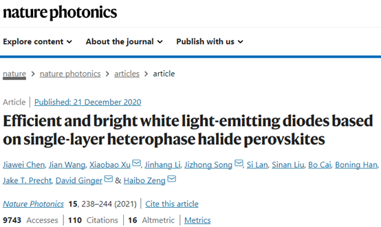具有自陷态激子特征的金属卤化物材料被认为是下一代健康、高质量照明的理想候选材料。此种材料的宽谱发光可覆盖整个可见光光谱(全光谱照明),同时具有大的斯托克斯位移(避免自吸收效应)。将自陷态材料作为单一发光层并以此构筑电致发光器件,不仅可以从源头上最大限度地减少蓝光污染(无蓝光激发源),而且避免自吸收效应,同时克服了传统LED光激发过程中二次能量损失并简化器件结构。2018年,研究人员报道了具有超高荧光量子产率(86%)的自陷态双钙钛矿材料Cs2(Ag0.60Na0.40)InCl6(Nature 563 (7732), 541-545)。然而,较差的电荷传输特性阻碍了自陷态材料进一步实现高效电致白光。2021年,研究人员通过设计同质异相结构α/δ-CsPbI3,借助异相光电协同效应有机结合优异光电性能及载流子传导能力和的自陷态宽光谱特性,最终获得了外量子效率6.5%、亮度超过12200 cdm-2的高效高亮度电致白光,达到了商业应用阈值(外量子效率6%,亮度1000-10000 cdm-2)。相关研究成果以“Efficient and bright white light-emitting diodes based on single-layer heterophase halide perovskites” 为题发表在Nature Photonics 2021,15 (3), 238-244。