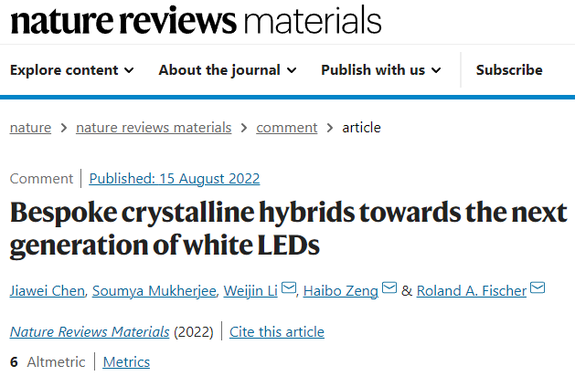根据《World Energy Outlook 2021》分析,白光照明的电能消耗约占每年全世界电量的20%,并占据了全球12%的二氧化碳排放量。发光二极管(LED)是电力驱动的光源,具有体积小、重量轻、能效高等优势。目前商业化的LED照明技术为蓝光LED芯片(如氮化镓)激发荧光粉产生互补色从而混合形成白光,该成果也获得2014年的诺贝尔物理学奖。高亮度白光LED的问世颠覆了现代人类的生活。不过,问题也随之产生。