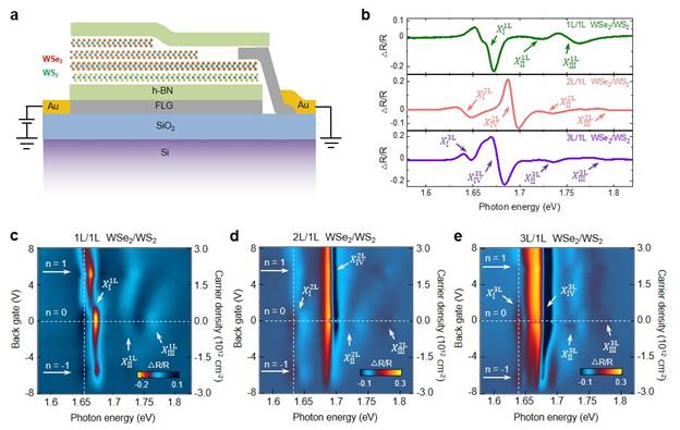 图1. WSe2/ WS2莫尔超晶格异质结示意图,以及不同层数时对应的反射光谱。