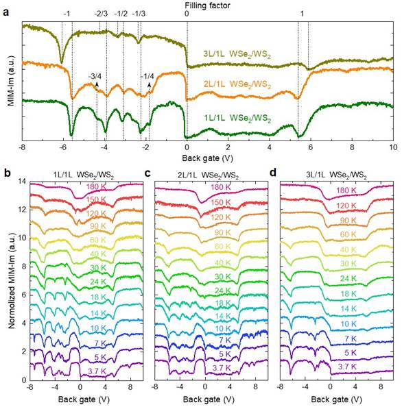 关联电子态对WSe2的层数也具有敏感性。电荷填充为n=-1时的Mott绝缘态的转变温度在1L/1L WSe2/WS2结构中可以维持到180 K,2L/1L WSe2/WS2结构中可以保持到120 K,3L/1L WSe2/WS2结构中可以保持到60 K。电荷分数填充的关联态在3L/1L WSe2/WS2异质结中则明显淬灭(图2)。在多层WSe2/WS2异质结构中,Mott转变温度虽然有所降低,但仍然远高于石墨烯莫尔超晶格结构中的转变温度。由此可见,层数自由度在调控莫尔超晶格体系中的强关联电子态方面,同样具有独特的优势。