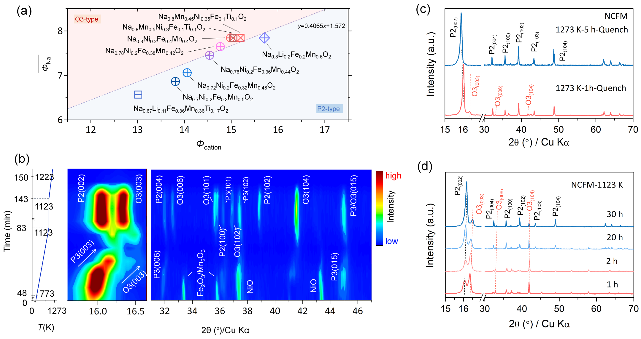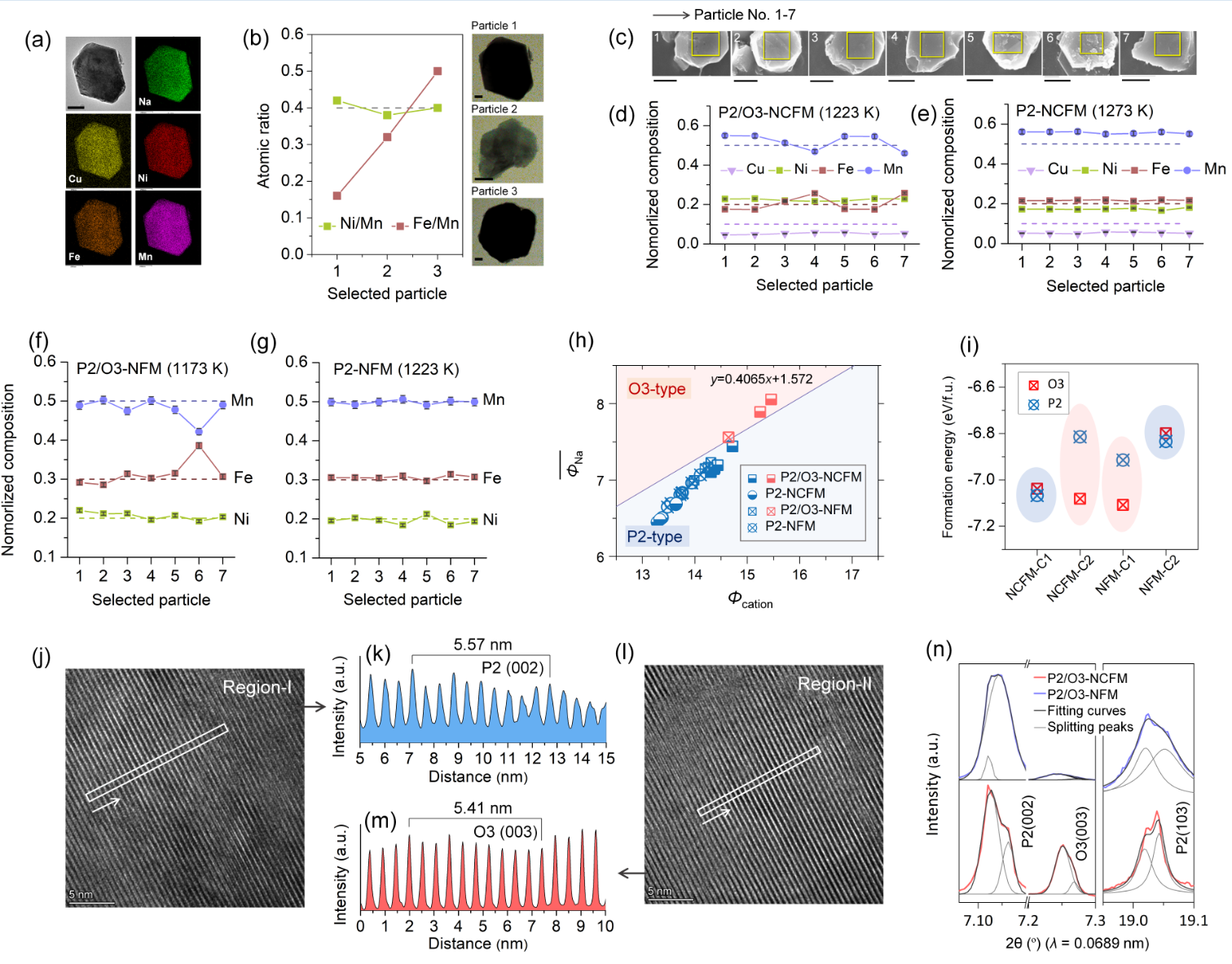 含钠层状氧化物比容量高、结构多样、组分可调、制备简单,是极具前景的钠离子电池正极材料之一。其中,P2型材料含有较多的Na+空位和相对较低的 Na+扩散势垒,通常表现出较好的动力学性能,但较低的钠含量限制了可提供容量,且深度脱钠后常伴随剧烈相变,结构稳定性较差;O3型材料则具有更高的钠含量,可提供更高的初始容量,更具实用前景,但往往相变过程复杂,倍率性能欠佳。鉴于此,设计P2/O3共生双相层状氧化物材料以耦合两种结构的优势成为了近年来的研究热点。现有研究表明,构建P2/O3共生复合结构确实可在一定程度上提升材料的整体性能表现(相比于单相材料)。然而,当前报道对于复合相材料的形成机制关注较少,该类材料的设计与合成仍缺乏明确的指导依据。此外,复合相构型与材料电化学行为之间的构效关系也有待进一步明晰。