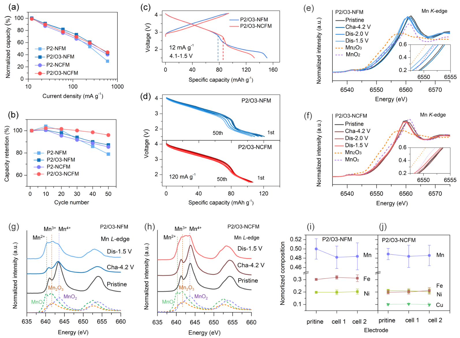 (c-j)P2/O3-NFM和P2/O3-NCFM的(c-d)充放电曲线、(e-f)非原位MnK-edgeXANES、(g-h)非原位MnL-edgeXANES和(i-j)组分变化(ICP-OES)对比;