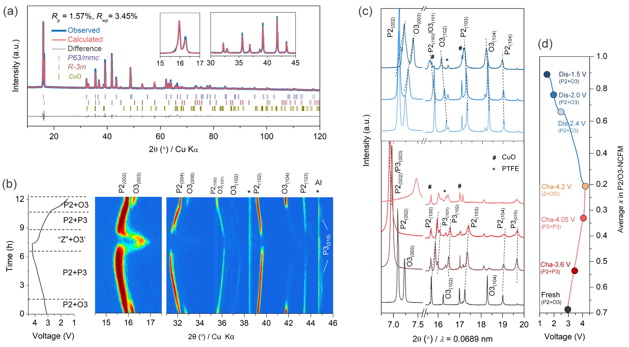 (b)P2/O3-NCFM在充放电过程中的原位XRD和(c-d)非原位同步辐射XRD图谱。