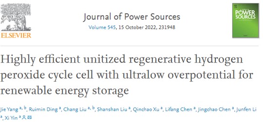 [3] J. Yang, R. Ding, C. Liu, S. Liu, Q. Xu, L. Chen, J. Chen, J. Li, X. Yin, Highly Efficient Unitized Regenerative Hydrogen Peroxide Cycle Cell with Ultra-Low Overpotential for Renewable Energy Storage. J. Power Sources, 2022, 545: 231948.