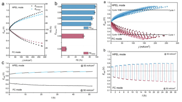 亮点3:该一体式过氧化氢循环电池(UR-HPCC)可以实现在H2O2电解模式(HPEL 模式)下高效产氢(FEH2 >90%), 在燃料电池模式(FC模式)下合成过氧化氢(FEH2O2 > 60%); 并且在两种工作模式下的总过电位小于10 mV,能量循环效率(RTE)超过90%。