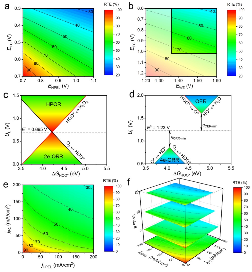 作者对UR-HPCC系统的能量循环效率(RTE)进行了理论构建与分析。传统的水-氢循环方式的可逆燃料电池(URFC)系统,受限于4电子ORR和OER过程中间体的线性约束,存在较大的热力学极限过电位,使得URFC系统的RTE无法突破75% (Figure 6)。而UR-HPCC因为巧妙的使用2电子ORR与HPOR反应,只存在单一反应中间体,可以通过催化剂设计,实现理论上的0mV过电位,进而使系统展现出极为优秀的RTE(最大值为99.6%),突破原有氢储能概念的局限,为未来大规模-长周期清洁电力能量存储系统与分布式储能系统的构建提供了极具吸引力的颠覆性概念与技术突破。