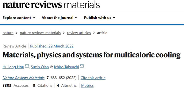 相关研究成果以“Materials, physics and systems for multicaloric cooling”为题发表在Nature Reviews Materials上。
