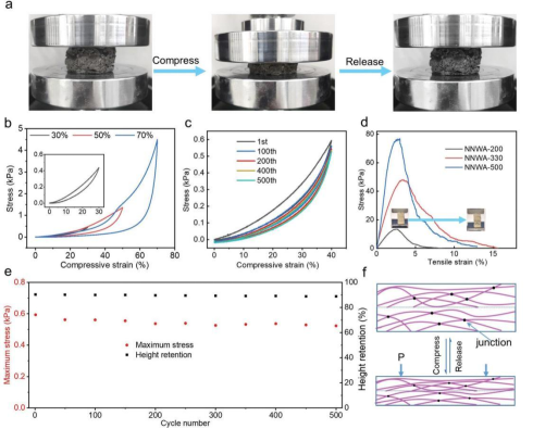 图3 NNWA的机械性能 a) NNWA 分别在压缩和释放后的照片;b) NNWA在不同最大应变的加载-卸载循环中的压缩应力-应变曲线;c) 40% 最大应变和不同循环次数下的压缩应力-应变曲线;d)被压缩的NNWA薄膜的拉伸应力-应变曲线;e) 在40%的最大应变下,500次压缩循环中最大应力和高度保持率曲线;f) 压缩前后 NNWA 变化的层状结构示意图。