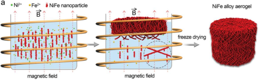 图5 NiFe气凝胶的制备和形态, 在亥姆霍兹线圈和冷冻干燥条件下合成 NiFe 气凝胶的示意图。