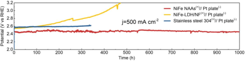 图7 采用不同电极作为阳极在 500 mA cm-2电流密度下 30 wt.% KOH 电解液中长期耐久性测试。