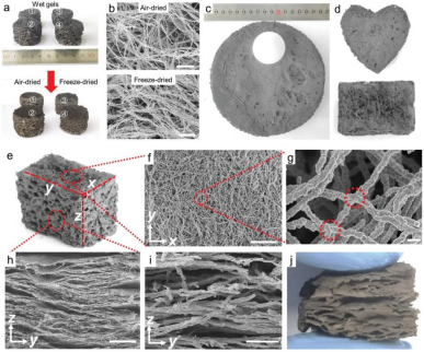 图2 NNWAs的形貌特征 (a) 空气干燥前后的NNWA照片;(b) 空气干燥和冷冻干燥后的NNWAs分别对应的SEM图像。比例尺为5 μm;c) 直径15 cm的NNWA照片,上面放着一个标准乒乓球;d) 切割成不同形状的NNWA 的照片;e) NNWA方块的照片;f) NNWA的xy平面SEM图像;g) NNWA中交织和冷焊接的纳米线的高倍SEM图像。虚线圆圈表示纳米线之间的连接点;h,i) NNWA的yz平面SEM图像。j) 显示 NNWA 层状结构的照片。(f)中的比例尺为25 µm,(g)为1 µm,(h)为100 µm,(i)为5 µm。