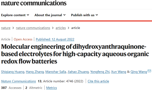 文献链接:Molecular engineering of dihydroxyanthraquinone-based electrolytes for high-capacity aqueous organic redox flow batteries (Nat. Commun., 2022, 13, 4746)