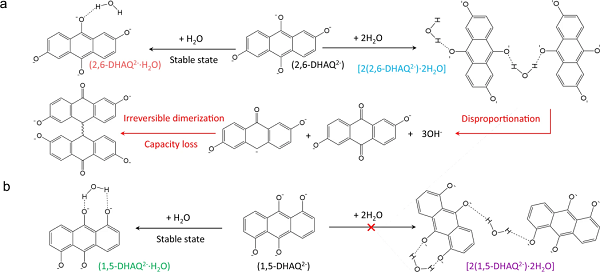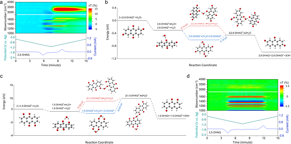 (b-c)在不同的氧化还原状态下,计算出2,6-DHAQ和1,5-DHAQ的能量变化。