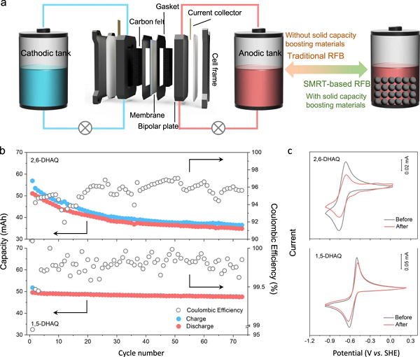 在过去几十年中,在开发可再生能源(即太阳能和风能)方面取得了重大进展。然而,它们在并网电力系统中的部署受到间歇性和波动性的限制。电化学储能(EES)系统提供了将太阳能和风能产生的电能可逆地转换和存储为化学能的重要手段,从而缓冲可再生发电机的波动功率输出及其对电网的影响。在所有EES系统中,水系有机氧化还原液流电池(AORFBs)是一种有前景的大规模电能储能技术,可实现间歇性可再生能源的高效利用。特别是有机分子是一类由地球上丰富的元素组成的无金属化合物,具有良好的合成可调性、电化学可逆性和反应速率。然而,AORFB的短循环寿命和低容量极大的阻碍了其实际应用。