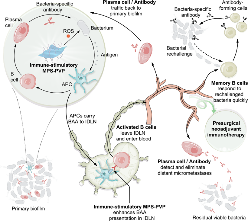 图1 免疫刺激性MPS-PVP用于诱导抗生物膜体液免疫和实现术前新辅助免疫治疗的示意图 © 2022 The Author(s)