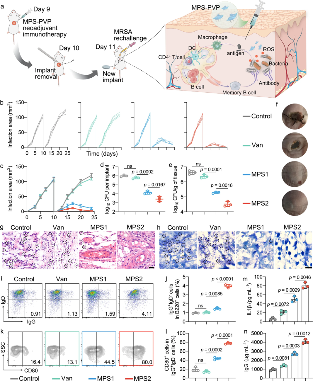 1、研究用聚乙烯吡咯烷酮(PVP)修饰的MPS纳米片材料能够在外科植入物感染的小鼠模型中触发强大的抗菌生物膜体液免疫。