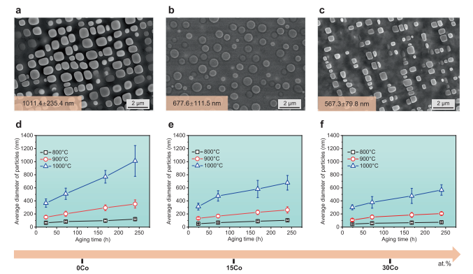 为了探索Co元素对CCAs中缓慢扩散动力学的显着影响,三种实验合金 Ni59.9-xCoxFe13Cr15Al6Ti6B0.1(x=0、15和30 at.%,分别表示为0Co、15Co和30Co CCAs),通过电弧熔化铸造,随后进行热时效处理。如图1a-c所示,具有0Co、15Co和30Co的三种CCAs的纳米颗粒的平均尺寸分别评估为1011.4±235.4 nm(图1a)、677.6±111.5 nm(图1b),和567.3±79.8 nm(图1c)在1000 °C下老化240 h。本工作进一步定量评估了三种CCAs中纳米颗粒的平均尺寸演变,随着不同温度下老化时间的变化,如图1d-f所示。本工作的实验表明,增加钴元素的浓度可以显着降低平均粒径并进一步提高这些纳米颗粒的热稳定性。