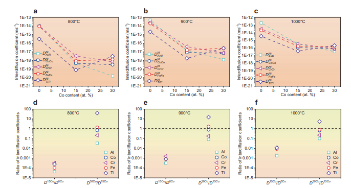 利用HitDIC软件和NiCoFeCrAlTi扩散倍数的组合,本工作计算了所研究的CCAs中不同含量(0、15和30 Co at.%)的FCC基质中Al、Co、Cr、Fe和Ti元素的相互扩散系数的变化。如图4所示,所有主要的相互扩散系数都随着Co含量的增加而降低。令人惊讶的是,Al元素的相互扩散系数从1.06×10-14 ms-1下降到 1.53×10−20 ms−1,随着Co含量从0增加到30 at.%,在800 °C时下降 5个数量级(图4d)。同时,它还表明,与Co、Cr、Fe和Ti等其他元素相比,Co元素导致Al元素的互扩散系数降低幅度最大(图4d-f)。因此,Co元素引起的所有主要元素间相互扩散系数的降低是所研究的CCAs中粗化机制转变的原因,这可能在控制SLD效应中发挥了意想不到的作用。