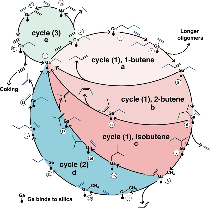 利用YARP结合反应界面的集群模型不仅发现以Ga-烷基为中心的Cossee-Arlman催化循环产生1-丁烯,而且还发现了用于副反应形成1-丁烯异构体、奇数-低聚物、烷烃和焦炭前体。