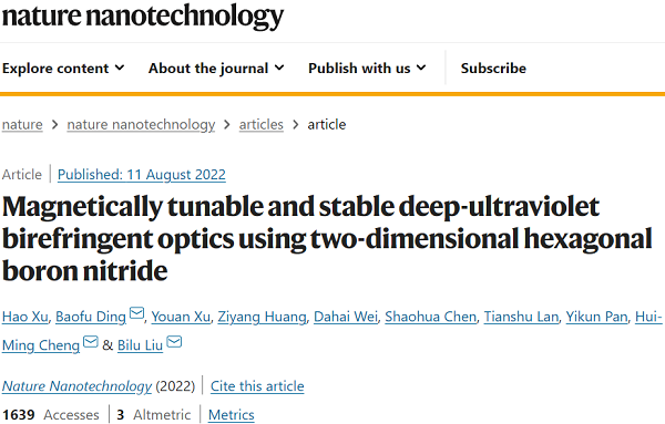 文献链接:Magnetically tunable and stable deep-ultraviolet birefringent optics using two-dimensional hexagonal boron nitride (Nature Nanotechnology 2022, DOI: 10.1038/s41565-022-01186-1)