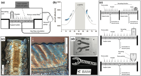 图7 (a)流动辅助粉末沉积过程,(b)模拟μ重力环境的抛物线飞行,(c)光学显微镜的前(左)和侧(右)面视图和(d)飞行期间制造的标本的最后物体,(e)辊式、箱型、v型三种涂覆设计。