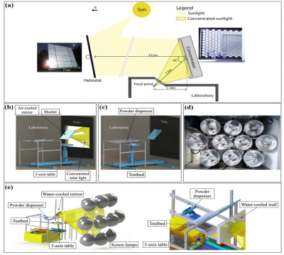图9 (a)太阳能灶示意图,(b)烧结过程中太阳能灶实验装置的3D示意图,(c)模拟风化层沉积过程中的三维草图,(d)太阳能模拟器的氙气灯,(e)太阳模拟器实验装置的3D示意图