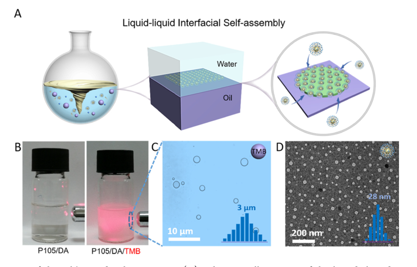 图1油/水双相体系的设计与形成:(A)介孔纳米材料的液-液界面自组装的示意图;(B)P105/DA和P105/DA/TMB胶束系统的数字照片;(C)TMB液滴的光学显微照片图像;(D)p105/DA/TMB胶束的TEM图像;(C)和(D)中的插图为其结构模型和尺寸分布直方图。 @2022 ACS
