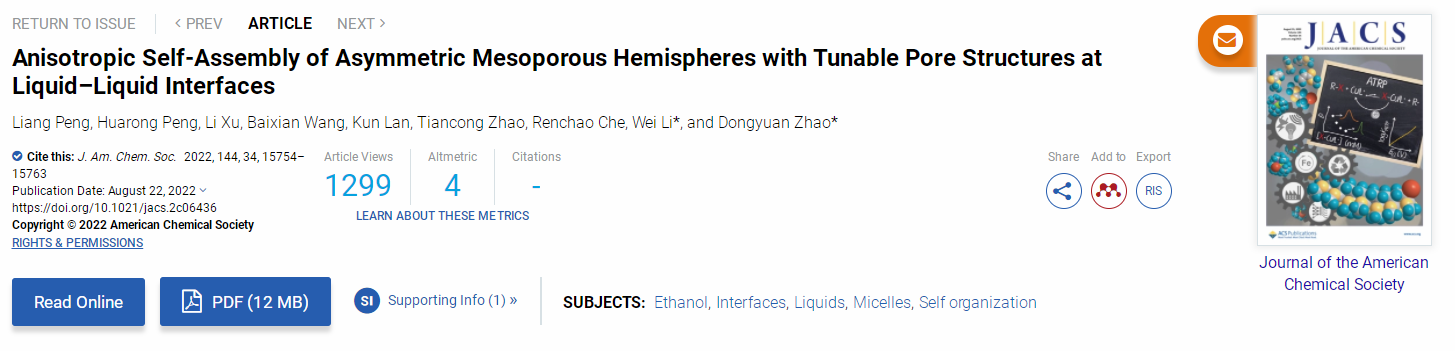 原文详情:Anisotropic Self-Assembly of Asymmetric Mesoporous Hemispheres with Tunable Pore Structures at Liquid–Liquid Interfaces. Journal of the American Chemical Society. 2022. https://doi.org/10.1021/jacs.2c06436