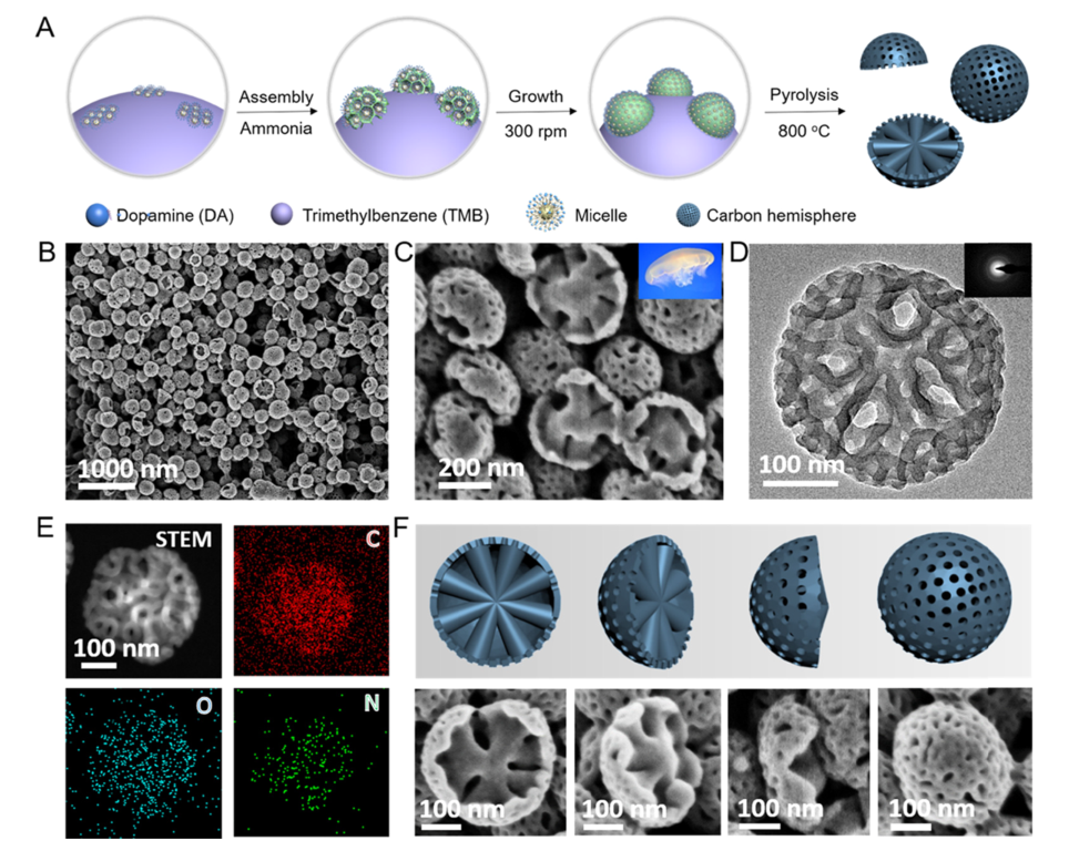 到目前为止,人们研究各类方法来制造具有不对称几何形状的碳球,例如界面诱导收缩、岛组装、外延生长、优先蚀刻等。然而,大多数形成的不对称碳半球是无孔的,极大地限制了它们内部基质的利用。将介孔和不对称特征的优点整合到一个实体中可能会带来增强甚至意想不到的物理化学性质。不对称介孔碳半球 (MCH) 可以通过使用表面活性剂胶束或胶体颗粒作为致孔剂来实现,但由此产生的孔结构通常随机分布或紧密堆积在基质中,因此,质量/离子传输能力会受到多孔结构的限制。复杂结构例如具有径向通道的多房腔的存在,对离子/分子扩散性和吸收能力非常有利。 此外,不对称MCH的形态控制也相当困难,部分原因是由于缺乏可同时实现形状设计和孔结构控制的自组装系统。