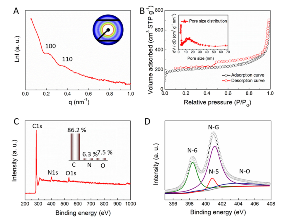 图3 水母样 MCH 的物理化学特征:(A) SAXS 模式和相应的二维 SAXS 模式(插图);(B)N2 吸附等温线和孔径分布(插图);(C)XPS 调查光谱和C、N和O的元素质量百分比;(D) 水母样MCH的N 1s XPS光谱 @2022 ACS
