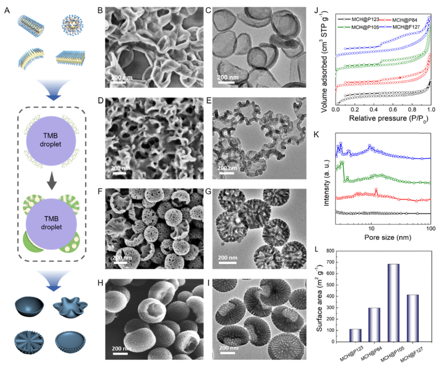图4界面能量介导的各向异性自组装策略的可控性:(A)用于TMB液滴界面自组装的不同结构的各种胶束示意图;(B-I) 以各种两亲性Pluronic(聚丙二醇与环氧乙烷的加聚物)三嵌段共聚物为模板合成的不对称介孔半球的SEM和TEM图像:(B,C)蛋壳,P123;(D,E)莲花,P84; (F,G)水母,P105和(H,I)蘑菇,F127;(J) N2 吸附等温线、(K) 孔径分布和 (L) 不对称介孔半球的相应表面积 @2022 ACS