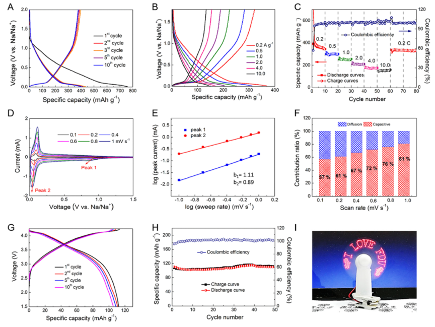 图5 用于SIBs的水母状MCH电极的电化学性能:(A) 0.1 A g-1低电流密度下的充电/放电曲线;(B,C) 0.2 至 10.0 A g-1的倍率能力测试;(D) 0.1至1 mV s-1 各种扫描速率下的CV曲线;(E) 不同峰的b值;(F)不同扫描速率下的容量贡献分数;(G) 水母状 MCH||Na3V2(PO4)2F3 全电池在 0.1 A g-1电流密度下的充放电曲线;(H) 完整电池在0.1 A g-1下的循环稳定性;(I) 由两个完整电池串联供电的智能电风扇的照片 @2022 ACS