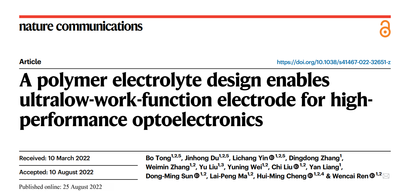 参考文献:Tong, B., Du, J., Yin, L. et al. A polymer electrolyte design enables ultralow-work-function electrode for high-performance optoelectronics. Nat Commun 13, 4987 (2022).