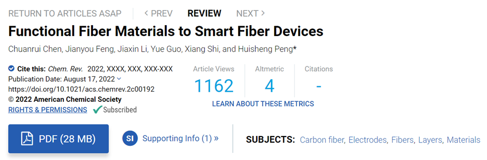 近日,复旦大学彭慧胜教授团队系统综述了智能纤维器件的发展历程和最新的研究成果。该综述首先回顾了近十年纤维材料的发展历史,并根据其功能进行了分类,然后讨论了纤维材料的基础知识和智能纤维器件的设计策略,并对近年来智能纤维器件的发展进行了全面而深入的分析。最后,该工作总结了该领域目前面临的挑战,并对未来的研究方向进行了展望。该研究成果以题为”Functional Fiber Materials to Smart Fiber Devices” 发表在国际著名期刊CHEMICAL REVIEWS上。