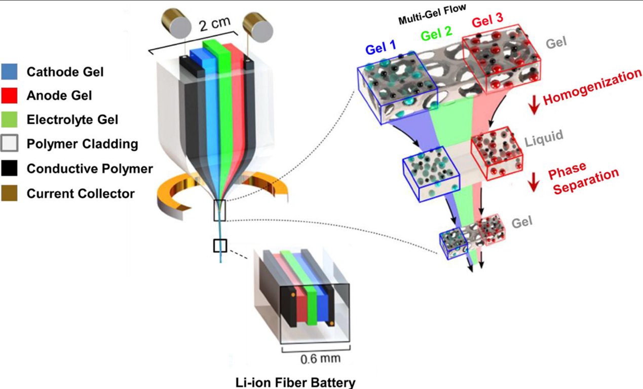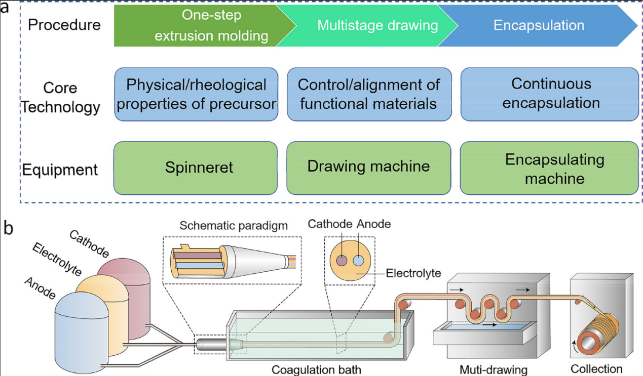 图3. a)一步挤压法制备智能纤维器件的工艺、核心技术和设备;b)通过一步挤压法连续制备纤维锂离子电池的示意图。