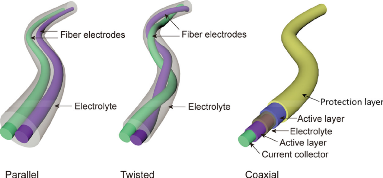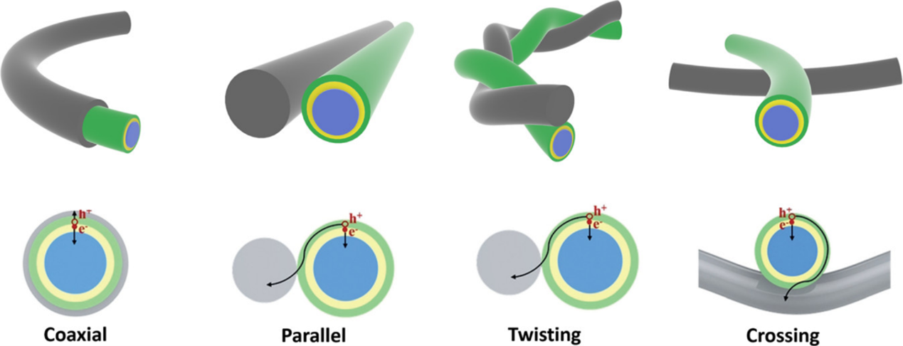 图4. 同轴、并行、扭曲和交叉四种类型的纤维器件中电荷传输路径。