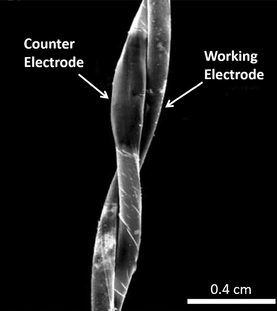 图9. 扭曲缠绕的纤维状染料敏化太阳能电池的SEM照片。