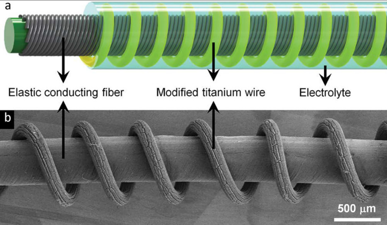 图16. a)纤维状超级电容器的结构示意图和b)制备示意图。