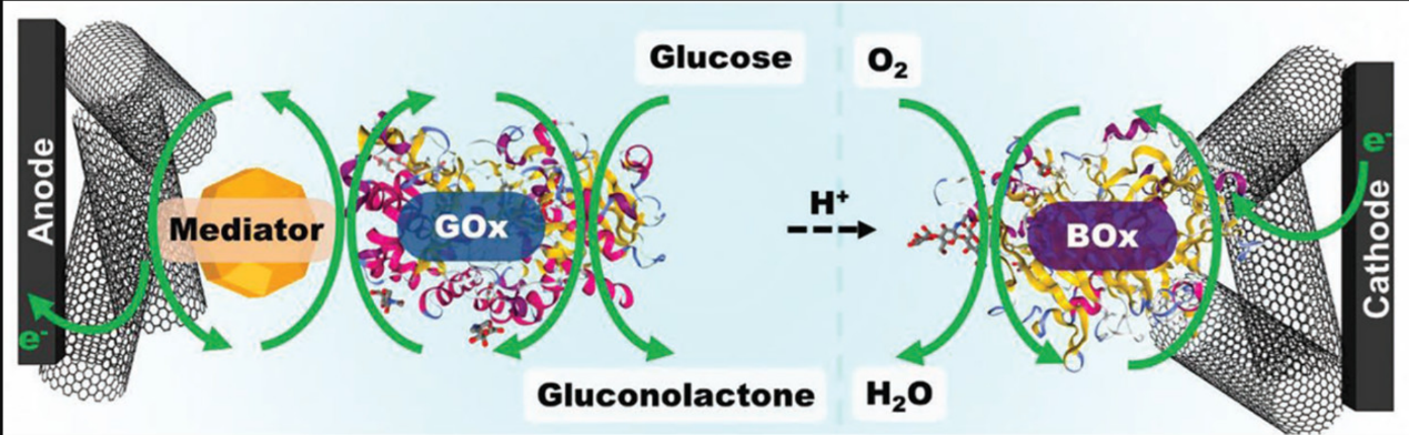 图14. 典型的葡萄糖/氧气生物燃料电池示意图。