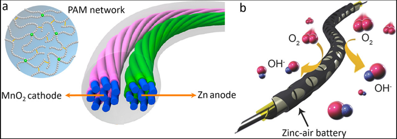 图19. a)含有二氧化锰的纤维状锌离子电池的结构示意图;b)全固态纤维状锌空气电池的工作示意图。