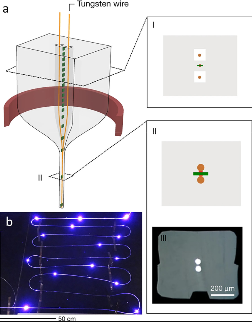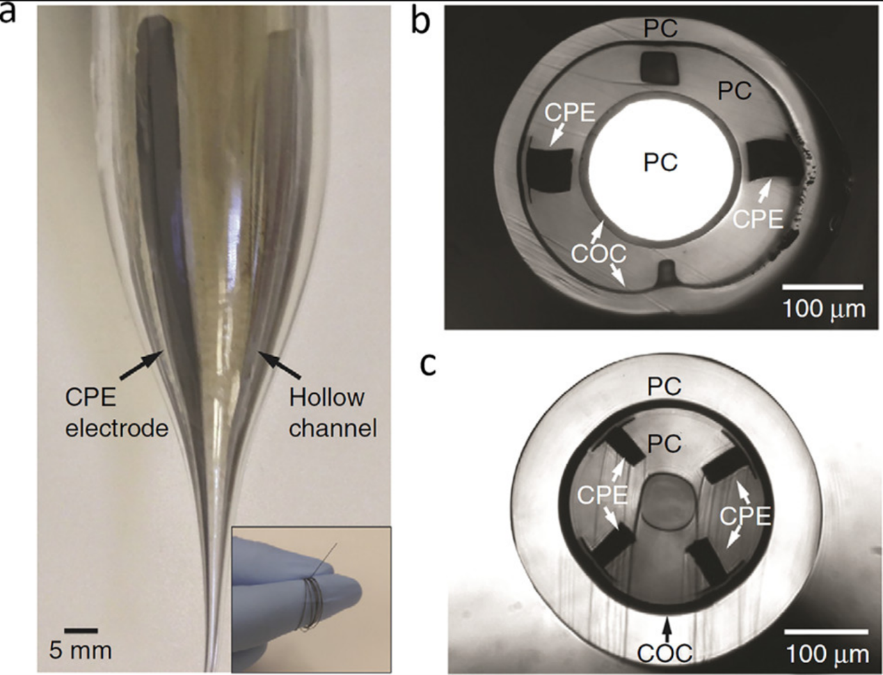 图27. a)多模态纤维电极热拉丝工艺照片,b-c)两种不同的多模态探头横截面光学图像。