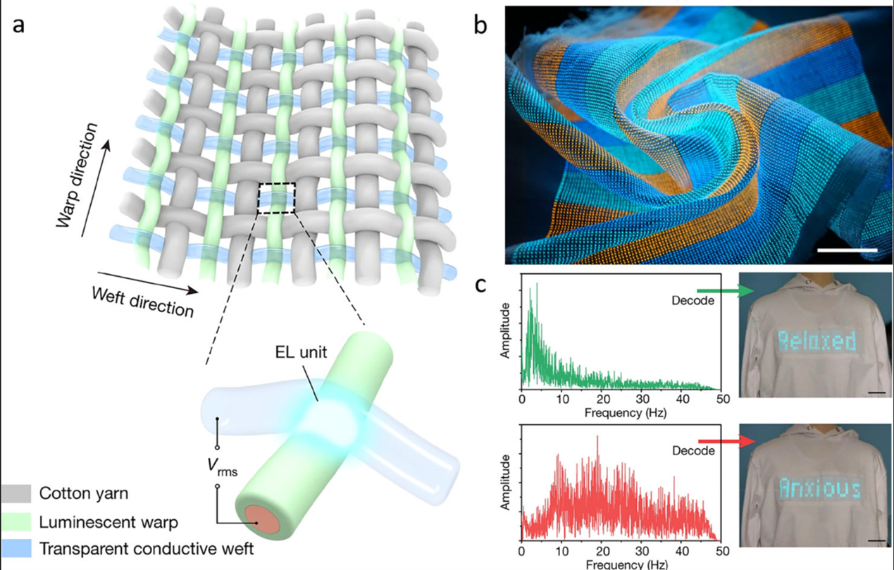 图24. a)发光织物的结构设计和原理图;b)大面积显示织物的实物图;c)织物显示器件实时反映健康状态的应用展示。