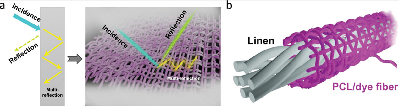 图26. a)通过纤维网络实现多反射的紫外光结构示意图;b)鞘芯结构示意图。